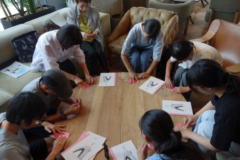 折り鶴ノートを進呈し、その中に入っている折り紙で一緒に折り鶴を折り、各々が平和に対する思いを書き込みました。