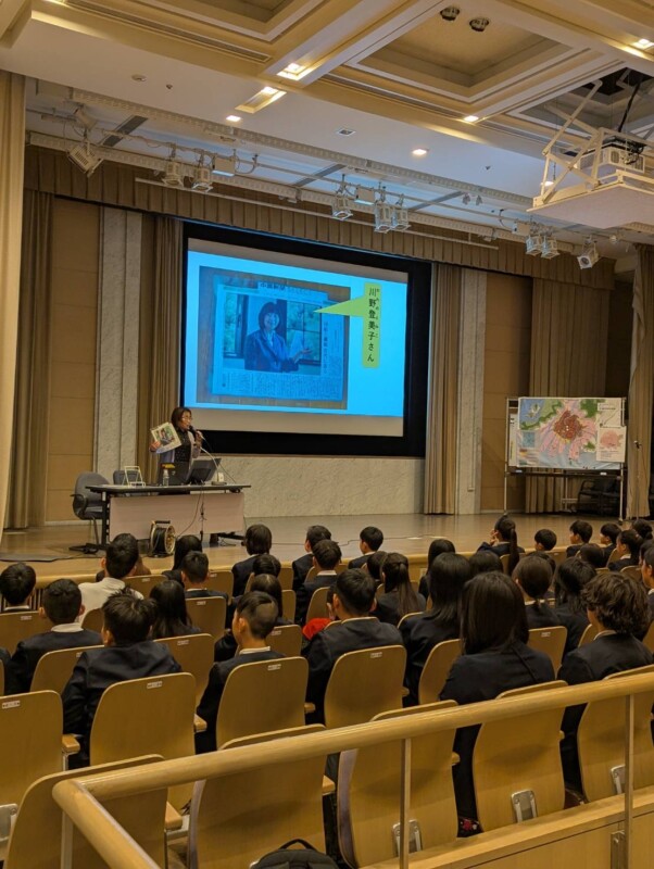 10月21日、貝塚市立南小学校の平和学習が広島平和記念資料館メモリアルホールで行われ、97名の生徒さんに講演しました。今回は「原爆の子の像 語り部の会」の陶山光恵さんに講演いただきました。事前に生徒さんの人数分折り鶴ノートをお送りしていたので、最後に折り鶴ノートの紹介もさせていただきました。詳しくはこちら